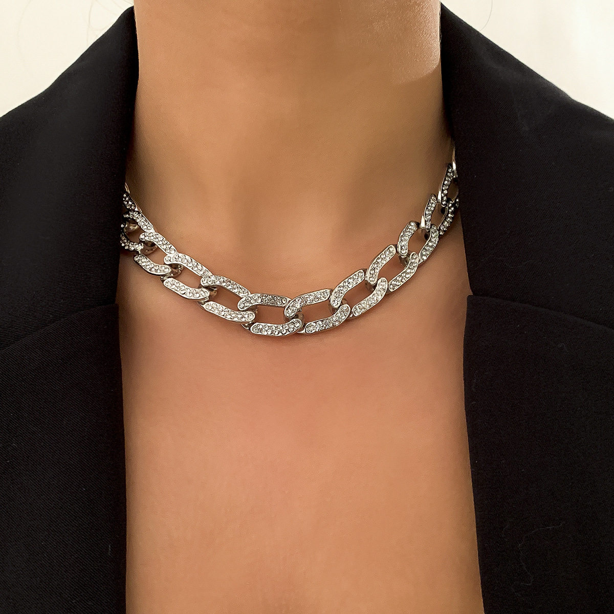 European And American Cross-Border Jewelry, Hip-Hop Diamond-Filled Cuban Chain Necklace For Women, Punk Simple Metal Chain Necklace With Rhinestones